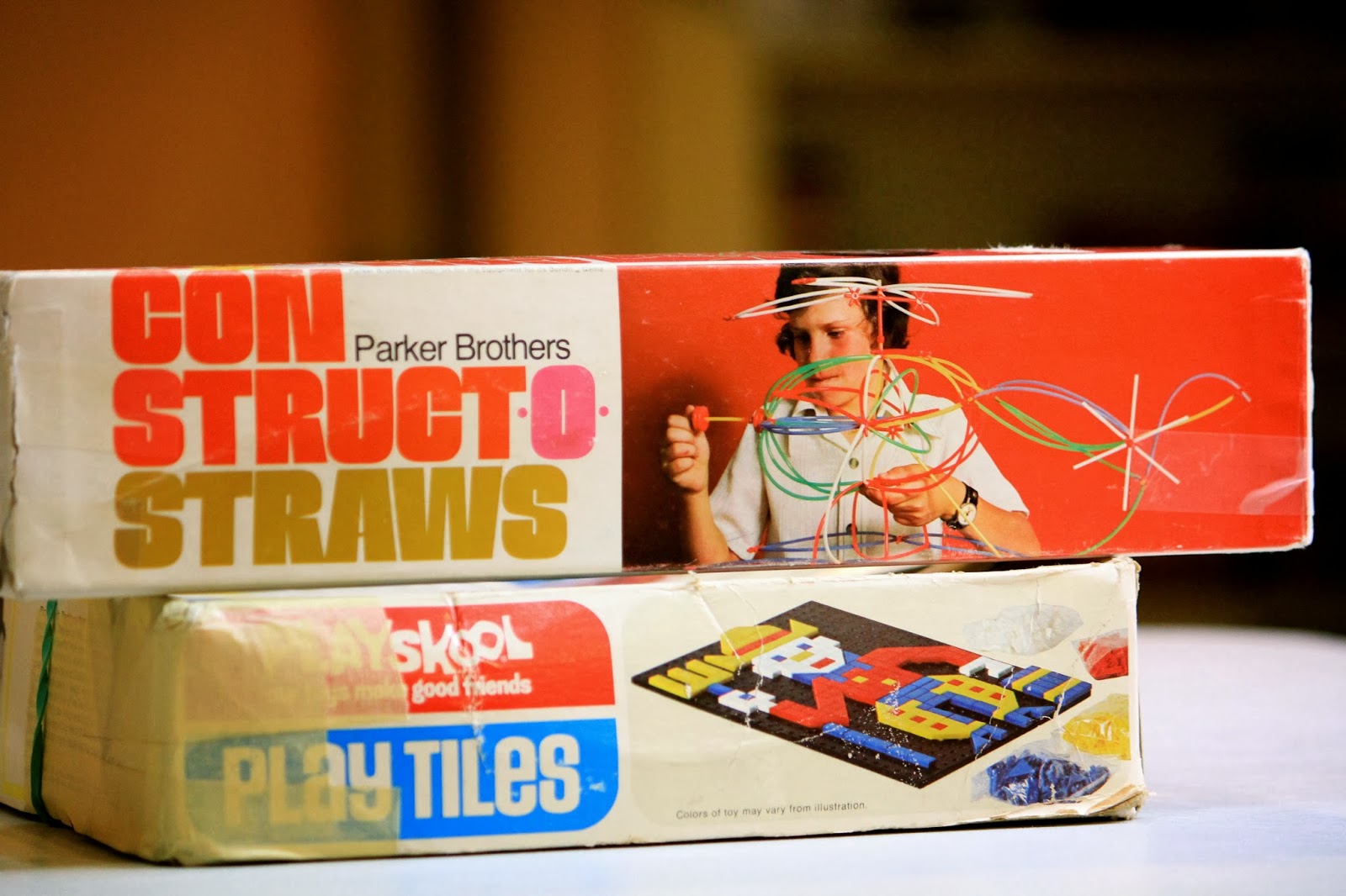 Sometimes I come across really old school games like Connect O Straws and this Playskool tile game. They are usually a lovely shade of burnt orange or avocado green and sold in boxes held together by yellowing masking tape. These little gems always make me smile. They are super cheap and kind of ugly so it’s easy to overlook their hidden potential. Toys from the 70’s are the best open ended toys on the table. Their simple design and no fuss no muss pieces are a great workout for the imagination.